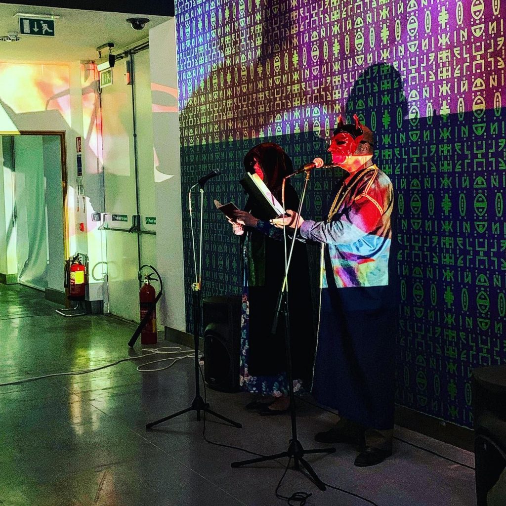 Towards the end of the exhibition, we were invited to create a performance/ritual in the gallery space. As we had just finished our audiovisual spell “Mementeros,” we decided to use that film as a framework for the performance.