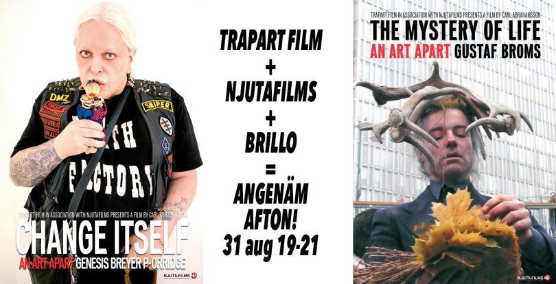 To celebrate the release of my two new films, there will be a get-together at groovy restaurant/bar/gallery Taverna Brillo in Stockholm. Pencil in the date and time: Wednesday, August 31st, 7-9 pm. All available Trapart Film DVDs released by Njutafilms will be available at a discounted price, including, of course, the two new ones: CHANGE ITSELF – An Art Apart: Genesis Breyer P-Orridge and THE MYSTERY OF LIFE – An Art Apart: Gustaf Broms. DJ Pontus Wedlund will provide a suitable mix of sounds and tunes! See you there! And if you can’t make it, you can find all the stuff here: on DVD or online! Thank you.