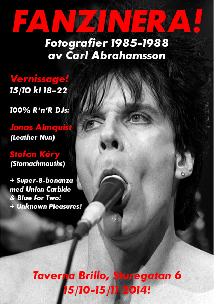 The relentless display of photographs from the book Fanzinera will now hit the scene of the crime itself: Stockholm. Between October 15th and November 15th, a selection of images will be displayed at Taverna Brillo, Sturegatan 6 (and Humlegårdsgatan 19). The opening evening will contain some enjoyable highlights: DJ-sets by Leather Nun’s own prime mover Jonas Almquist and The Stomachmouths’ Stefan Kéry. There will also be a screening of some super-8-films I made during that same era: a 25 minute documentation of Blue for Two and Freddie Wadling + a similar kind of film with Union Carbide Productions (23 mins). The book Fanzinera will be available for sale on the opening evening at a special, discounted price. If you can’t make it, the book is also available for sale via the TRAPART site. You are most welcome to travel back in time with me and the images at Taverna Brillo!