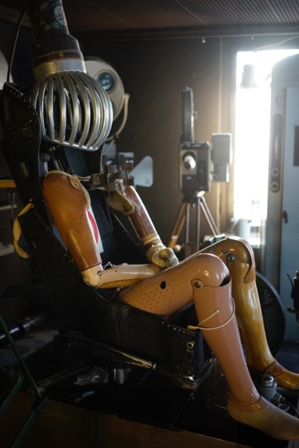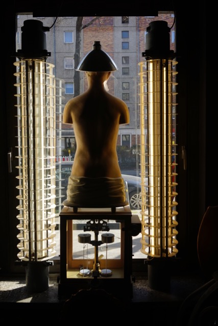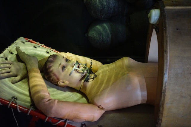 Our guide enthusiastically tells the story of a woman who remained in the displayed mechanical lung for 60 years, towards the end of her life also connected to a computer. He stressed that she was always happy. On the other side of the room a military bed has been morphed with a wooden tub of sorts, which has now taken the form of a torture instrument, with a female mannequin in bondage. Other mannequins have earth globes as heads, or hang from clothes hangers in the ceiling without heads. The Frankenstein attitude is clean, sterile, “sauber”, meticulous, walled in by symmetric displays of power tools and telephones from various ages. “Who you gonna call? Lebens-busters!”
